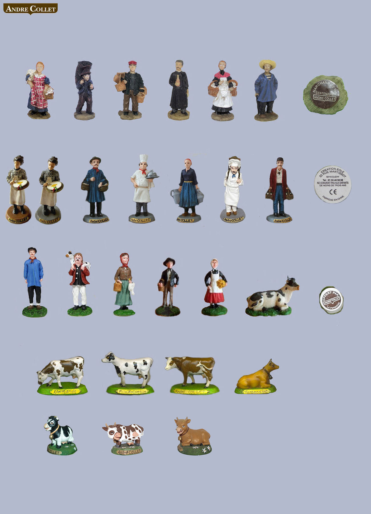 André Collet is THE big specialist of the famous cheese: the Brie de Meaux cheese. This family-run company dates 1899 and is situated to Raival (department of the Meuse - 55). He is not possible officially, to know the dates of these figurines and seems be missing at least a small young cow in the last series, presented on this page.