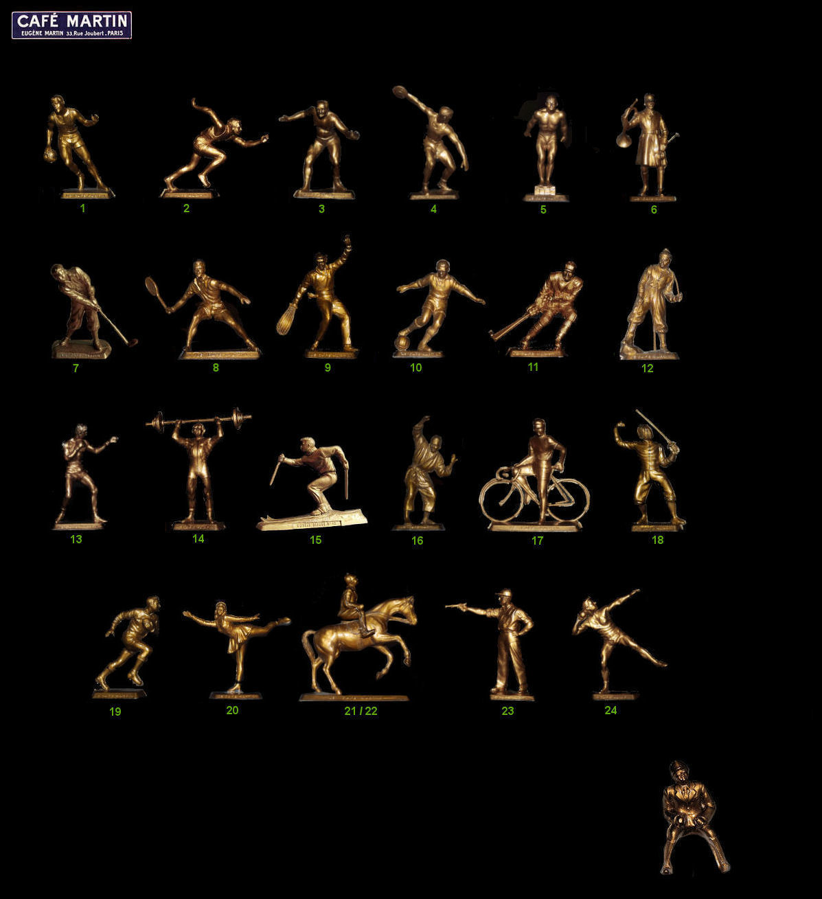 This serie of 1958, consists of 24 hard and golden plastic figures. Sports the known are represented as well as that of the hunting although moved with regard to the other presented disciplines. It is also a real festival of breakage. The rarest part is the bike intact.