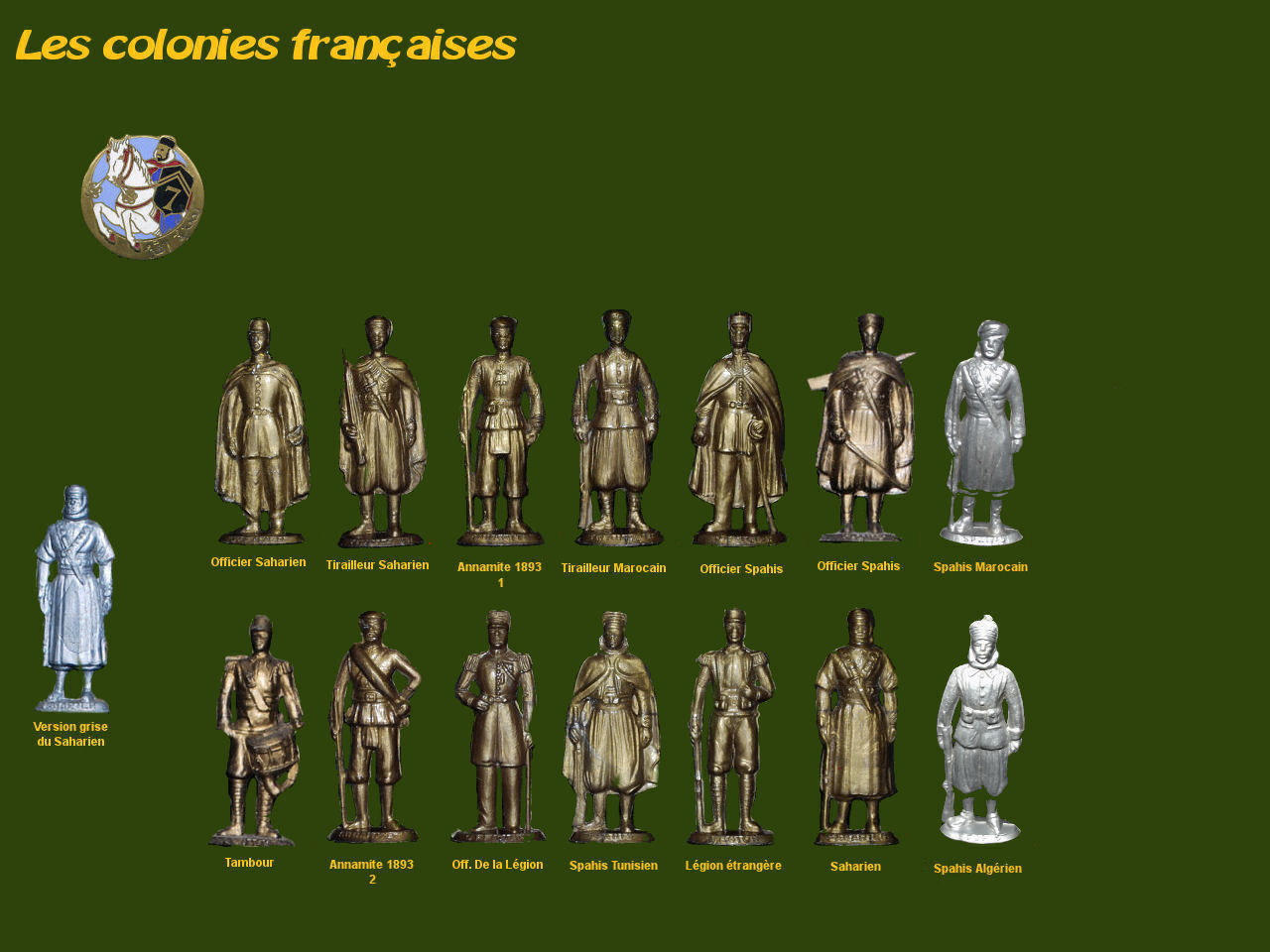 Cette série est constituée de 14 références. Les figurines représentent les Colonies Françaises fin 19ème début 20ème. Le rang du personnage est gravé tout autour du socle. L'annamite (Indochine) est bien gravé 2 fois sur les 2 figurines et différencié par les chiffres 1 ou 2. Sous le socle, les initiales WDP sont visibles. Est-ce la marque? le fabricant ? Toutes les infos seront les bienvenues.