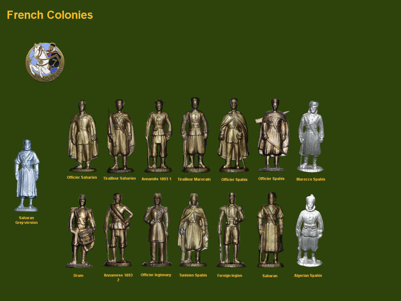 This series is constituted by 14 references. Figures represent the French Colonies the late 19th to the 20th beginning. The rank of the character is engraved all around the base. The Annamite (Indochina) is engravedtwice on 2 figurines and differentiated by 1 or 2. Under the base, the initials WDP are visible. Is it the brand? The manufacturer? All information is welcome.