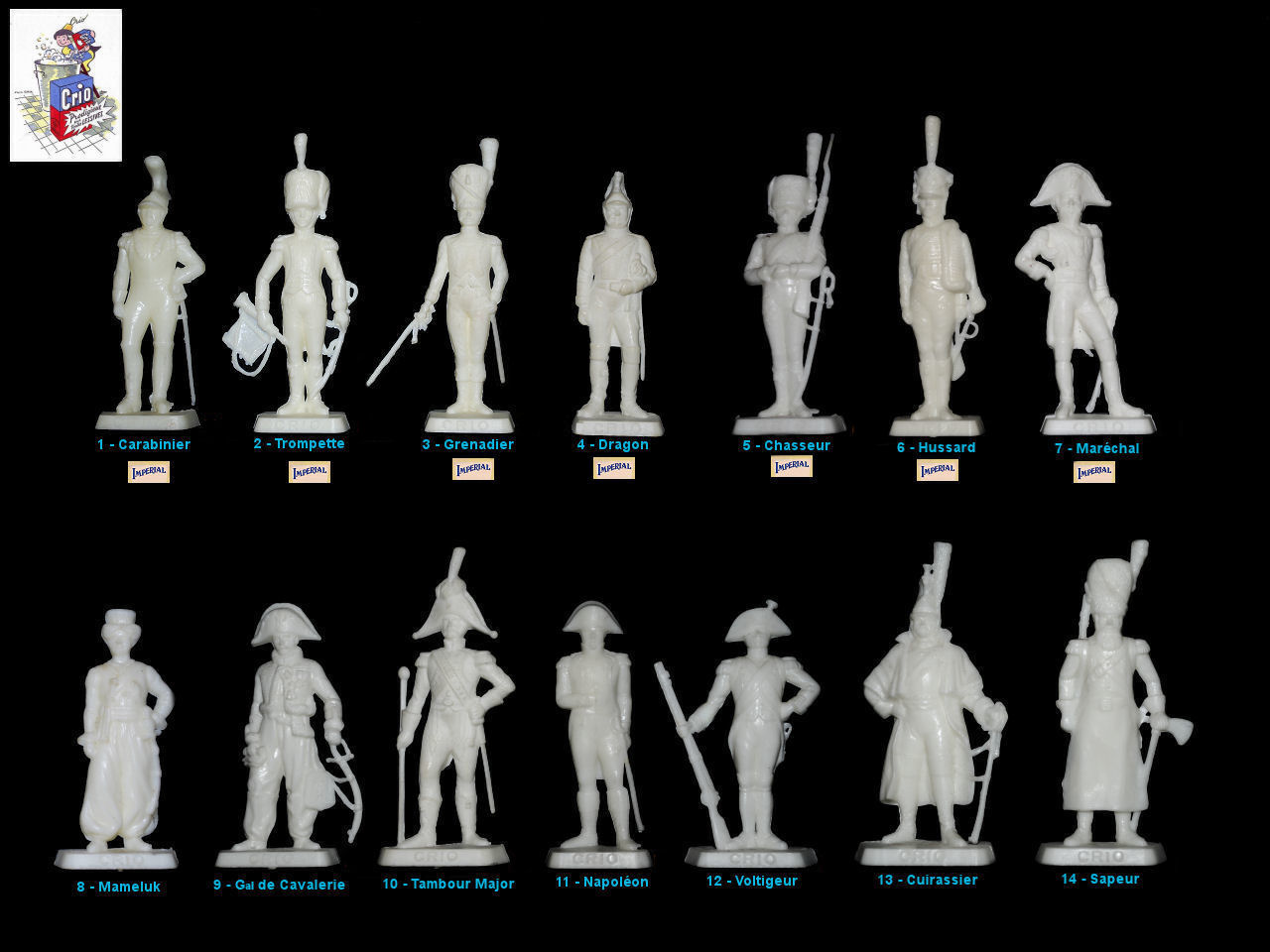 Series of 14 hard plastic figures. 7 first ones were brought back by the brand Imperial. Behind bases are engraved the number of the part and its weapon. We'll notice the spelling mistake of the Mameluke, the paper: "Mameluck". Crio is engraved at the front of the base.