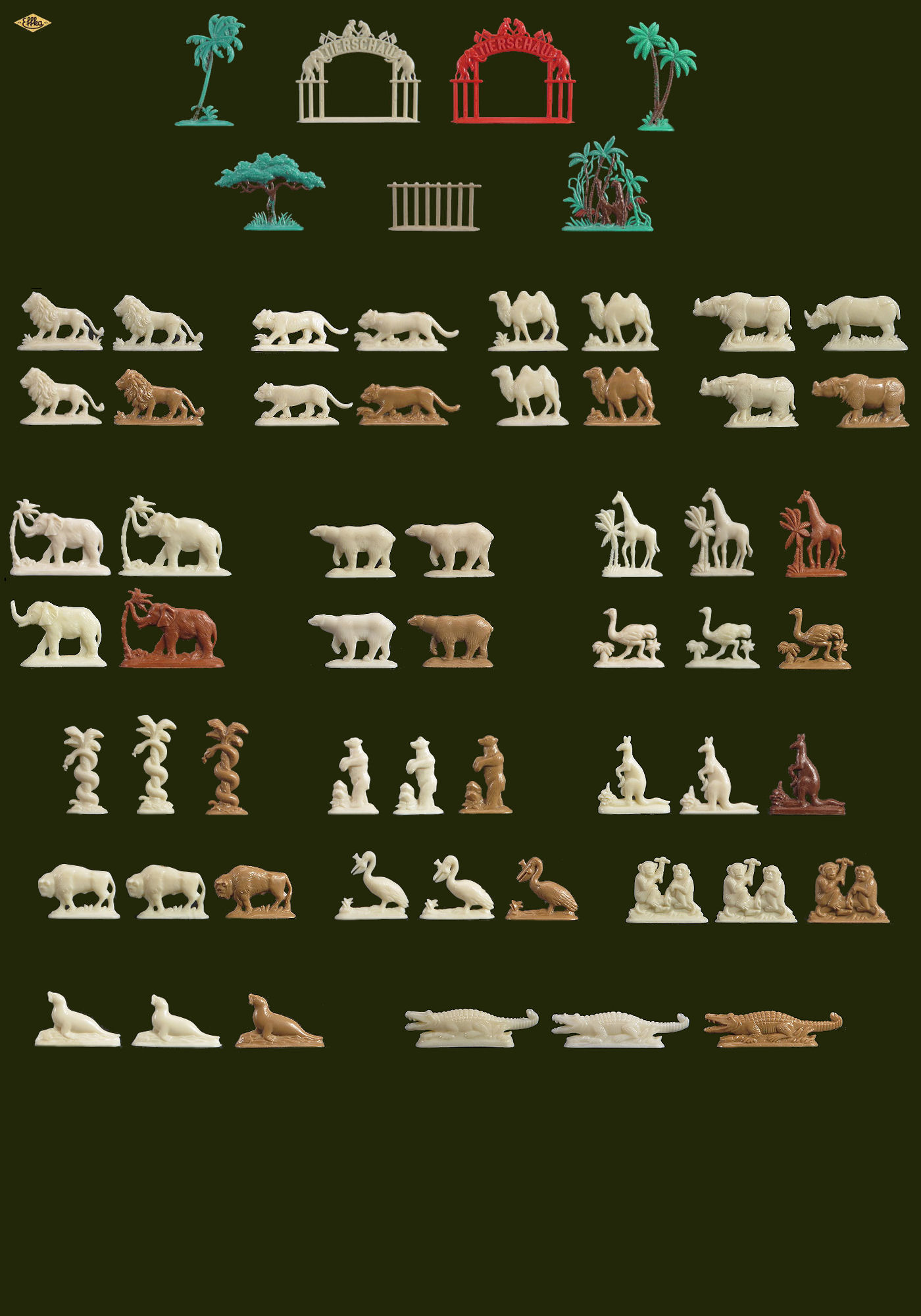 This German series of the 50s, consists on the base of 22 references, to which we add the variants (noted on the list - See circus Effka), what gives us 61 references + the number of necessary barriers for the preparation of the zoo adjacent to the circus.