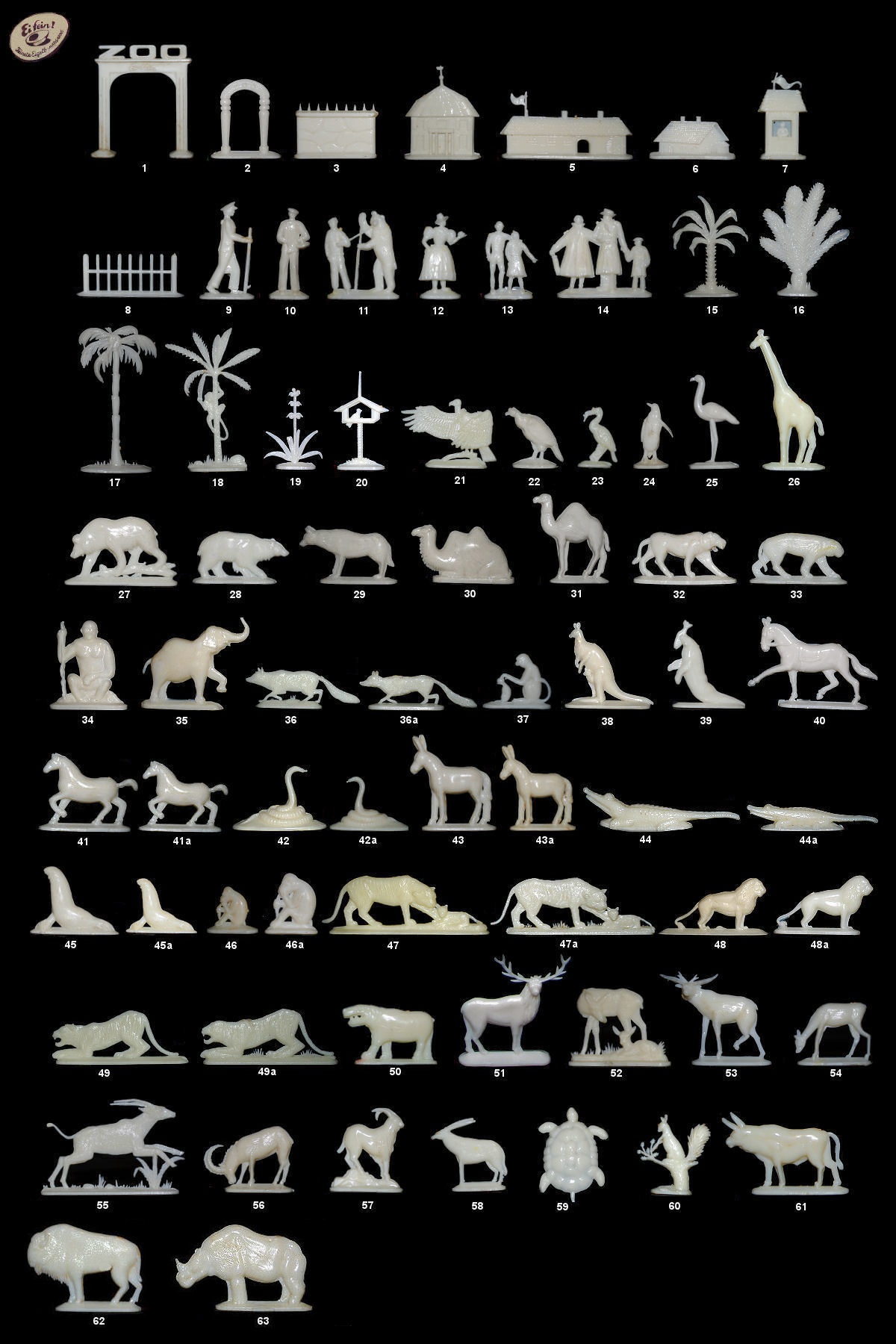 Very beautiful and big series of 63 references. Curiously we can find diverse sizes of animals (of 20mm in 30mm) fellow men or not. But as in a lot of German series, figures are made to constitute a diorama with an in-depth perspective. Those with the mention "a" possess a small addition as of the grass or a bigger base. Some references constituting the set are very rarely intact as 18 and 19.