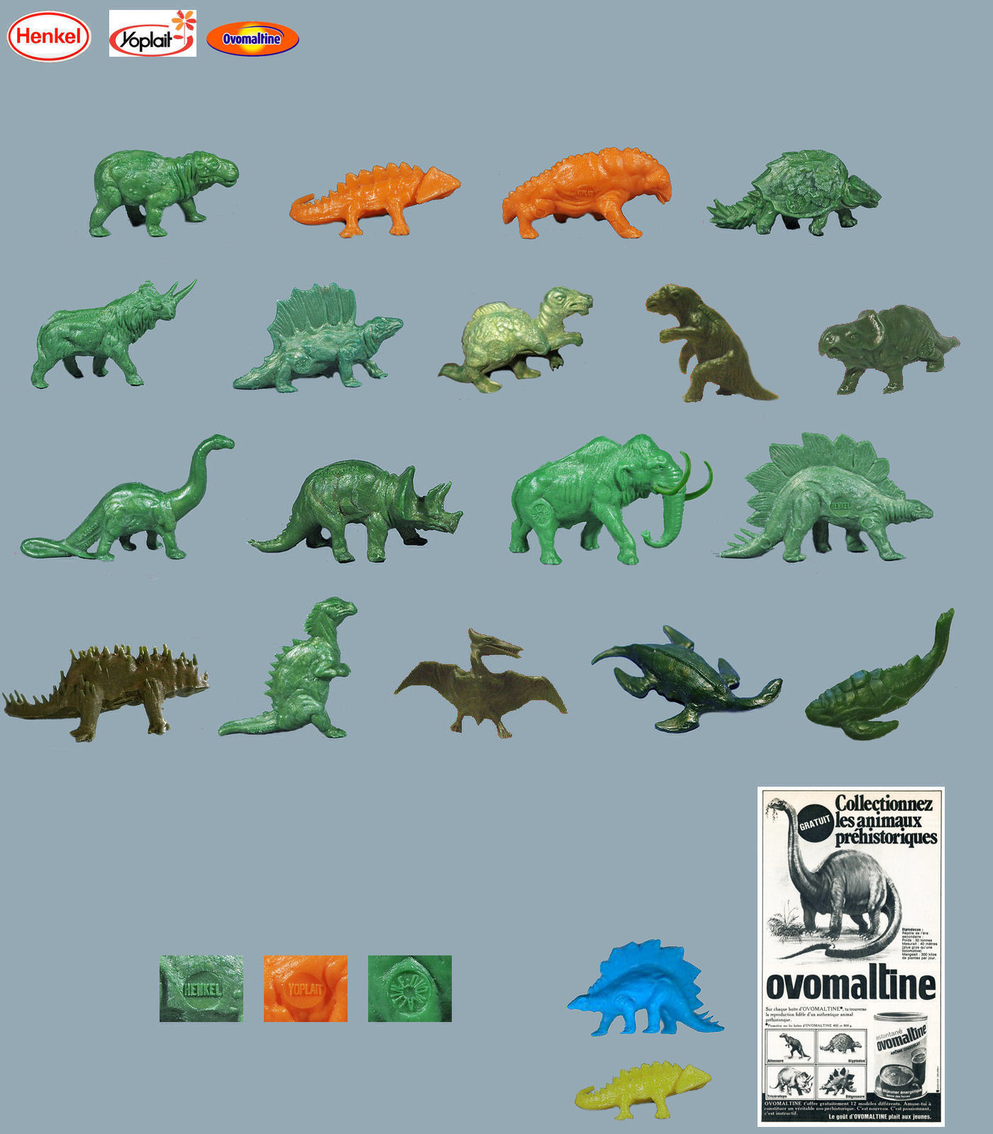 This series would contain 18 dinosaurs, but 18th, Ptérichthys (a fish), is extremely rare. It has no brand but the color, the engraving and the scale are the same. His name is also engraved on the part.. Three brands proposed them in the 70s: Henkel and Ovomaltine in green or khaki and Yoplait in orange, yellow or blue.