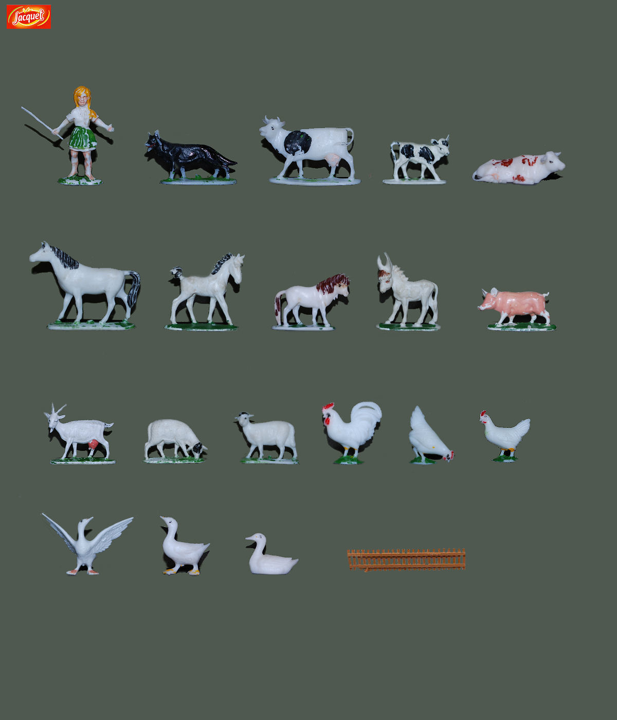 This series of 20 figures is offered by "Jacquet" in the lineage of that of the hunting. As the latter, figurines are made by the German Company of toy " West Germany ", but the brand "Jacquet" is engraved under the base or on part of the animal for the goose and the ducks. More bases are green.