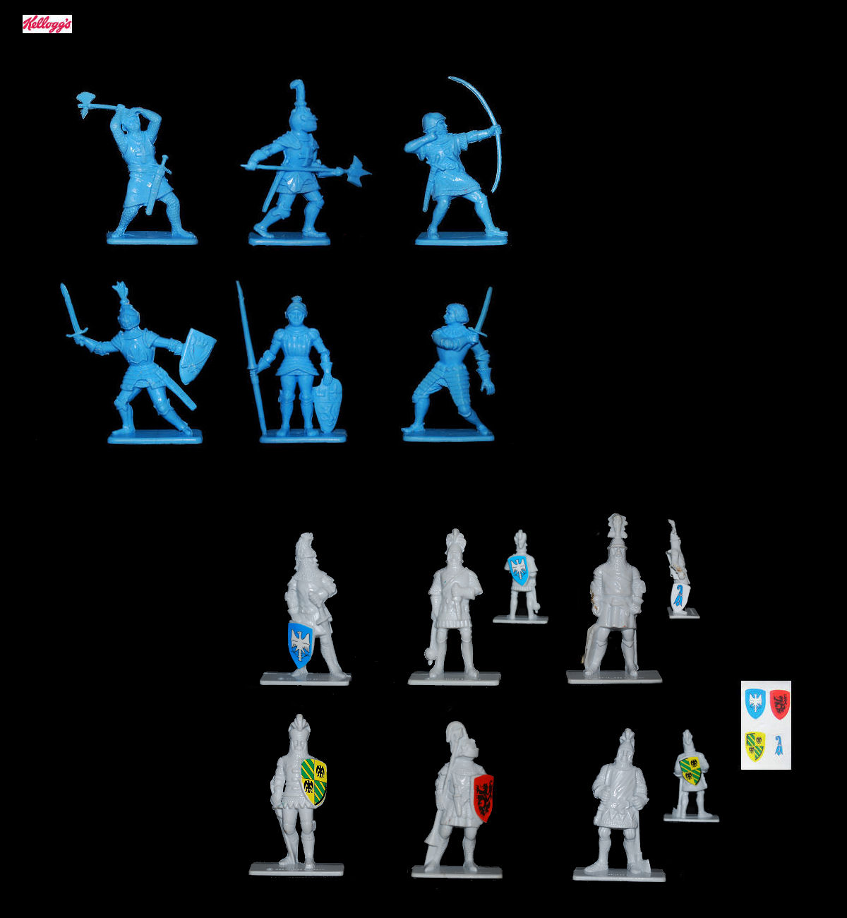 Of Kellogg's is engraved above every base. There are 4 self-adhesive blazons (become very rare) to affix on the shield of the characters.