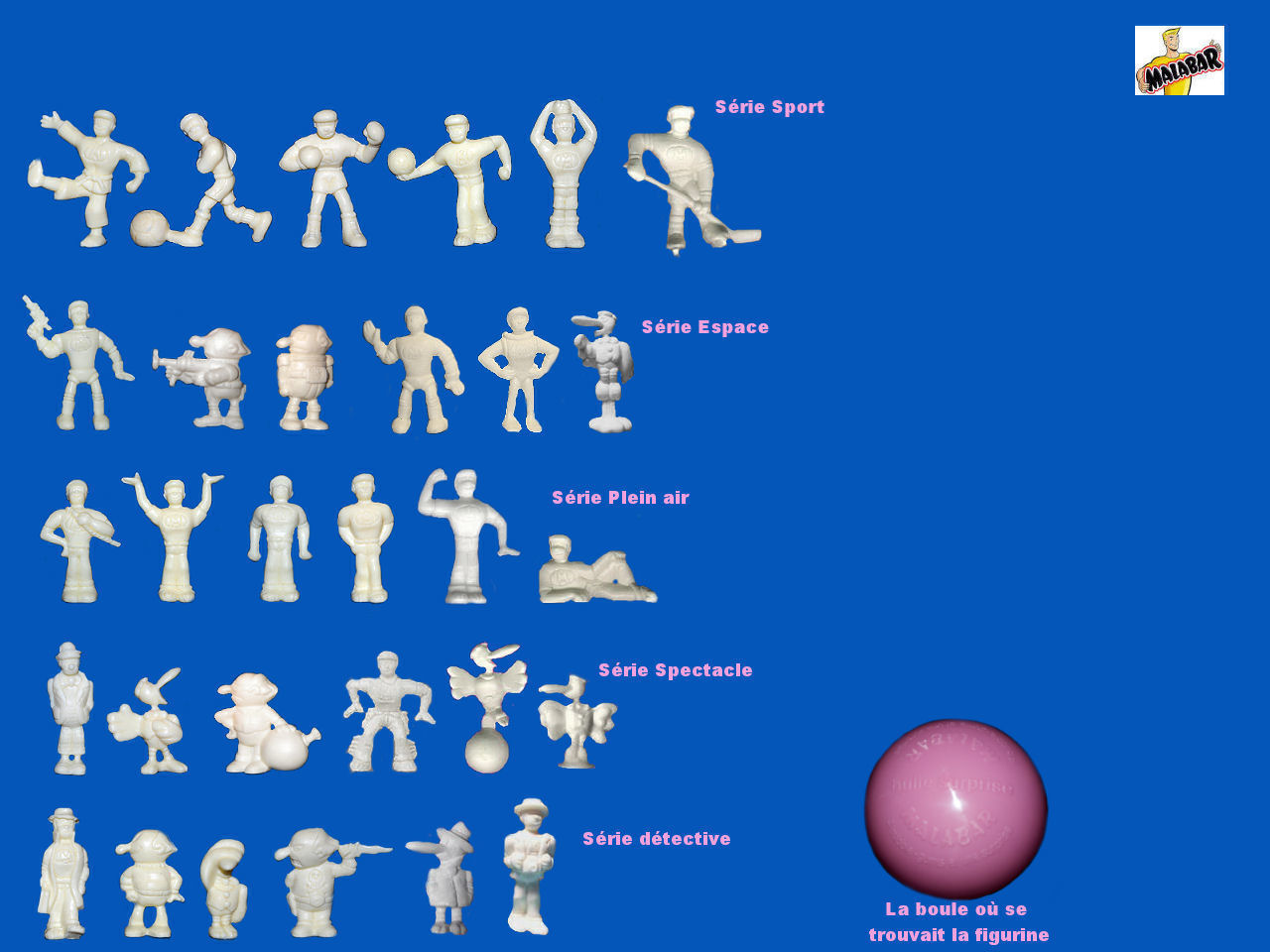 This series from the 80's consists in 30 flexible white plastic figurines. We found them in pink Malabar balls (see picture).