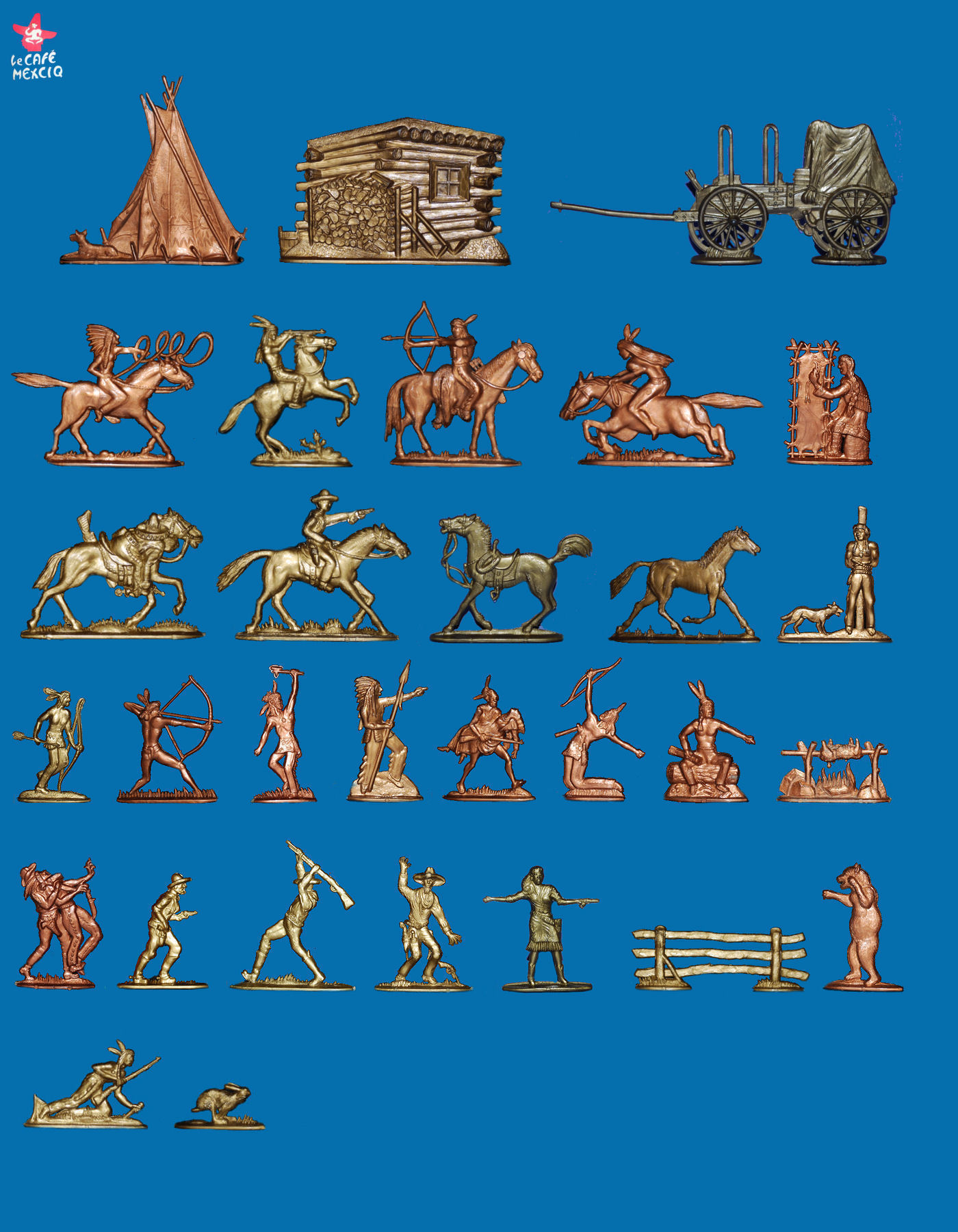 Série de 30 figurines pour les versions françaises en plastique dur. Il existe également des versions bazar en plastique souple argent ou or.