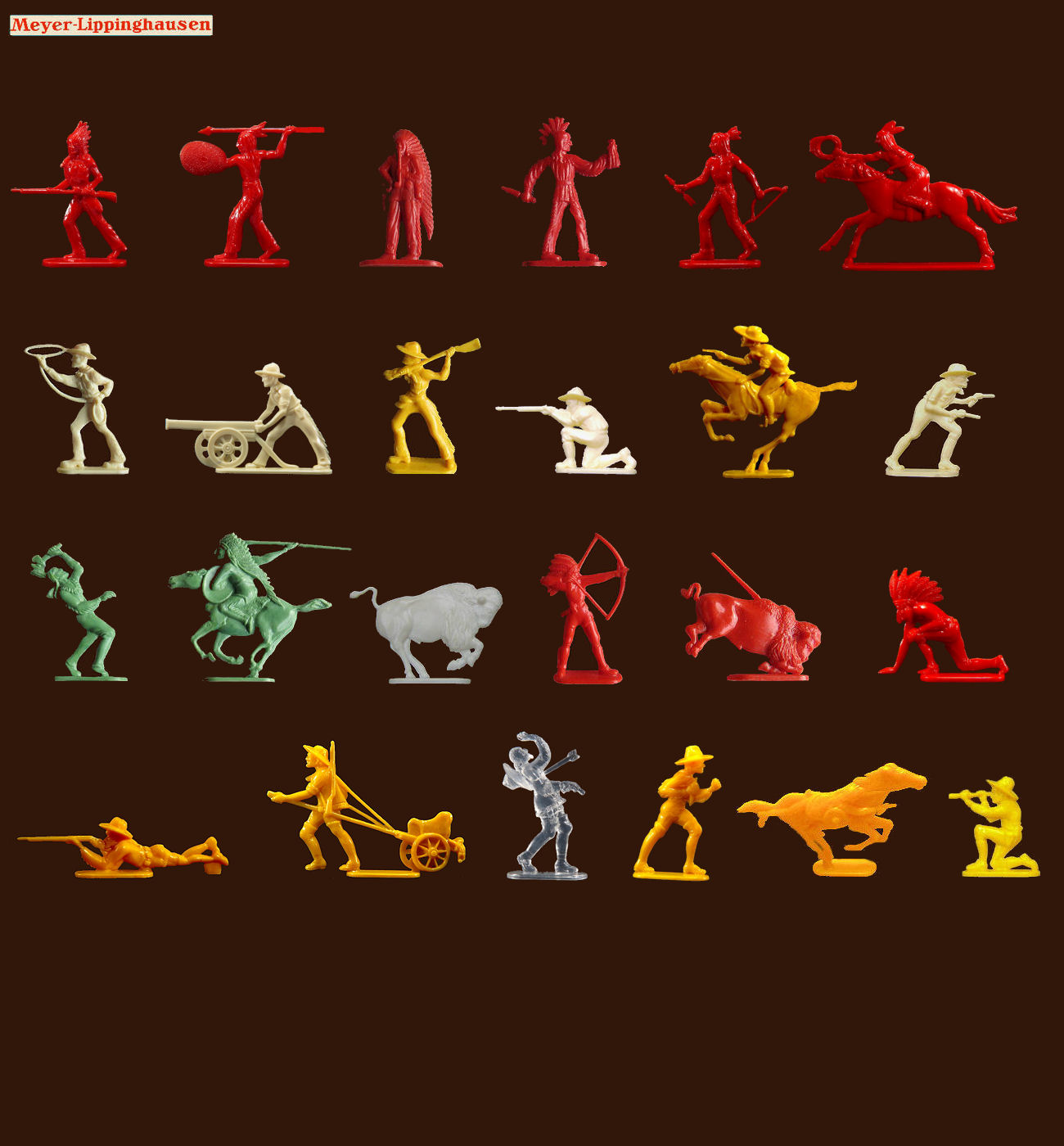 Here is a magnificent series of 24 figurines 45mm on the theme of the Western. The cowboy in the charette is magnificent but especially not easy to find intact. In example also, a very rare transparent version.