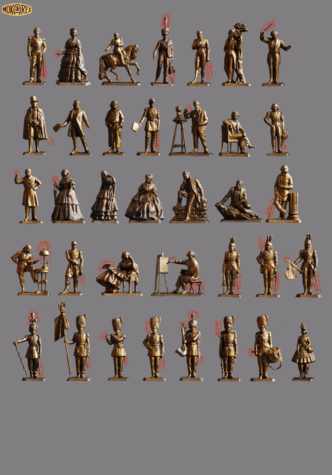This series dates 1956 and includes 36 figures in 54 mm. The name or the rank of the character is engraved on the front of the base and the period in the back. "Mokarex Déposé" is engraved under every figure.