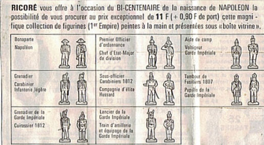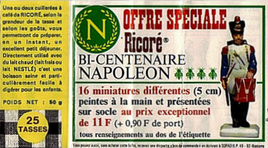 16 figurines of 45mm, taken out in 1969 for the bicentenary of the birth of the emperor. Bases are independent. Nestlé is engraved on one of side. The manufacturing is from Macao. A display stand was sent against 11 francs. Huilor and Kinder is going to republish the series. The reason of a detachable base is a very economic means to propose figures in the other marks by modifying only the base.