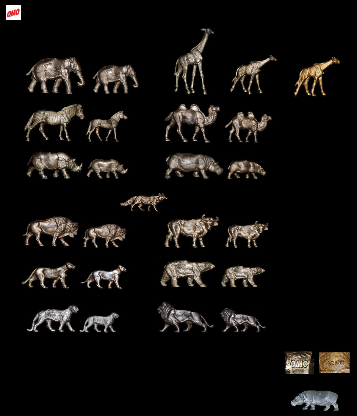This series consists of 25 figures in half-round work. They exist in three colors. The most current are golden, followed by some bronze and more rarely by color silver. Bonux will take back seven animal of this series.
