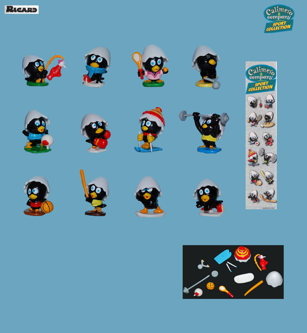 This second series Caliméro, on the theme of the sport, consists of 12 figures, accompanied with accessories for some. They are plastic hard and in the scale approximately 25 mm.
