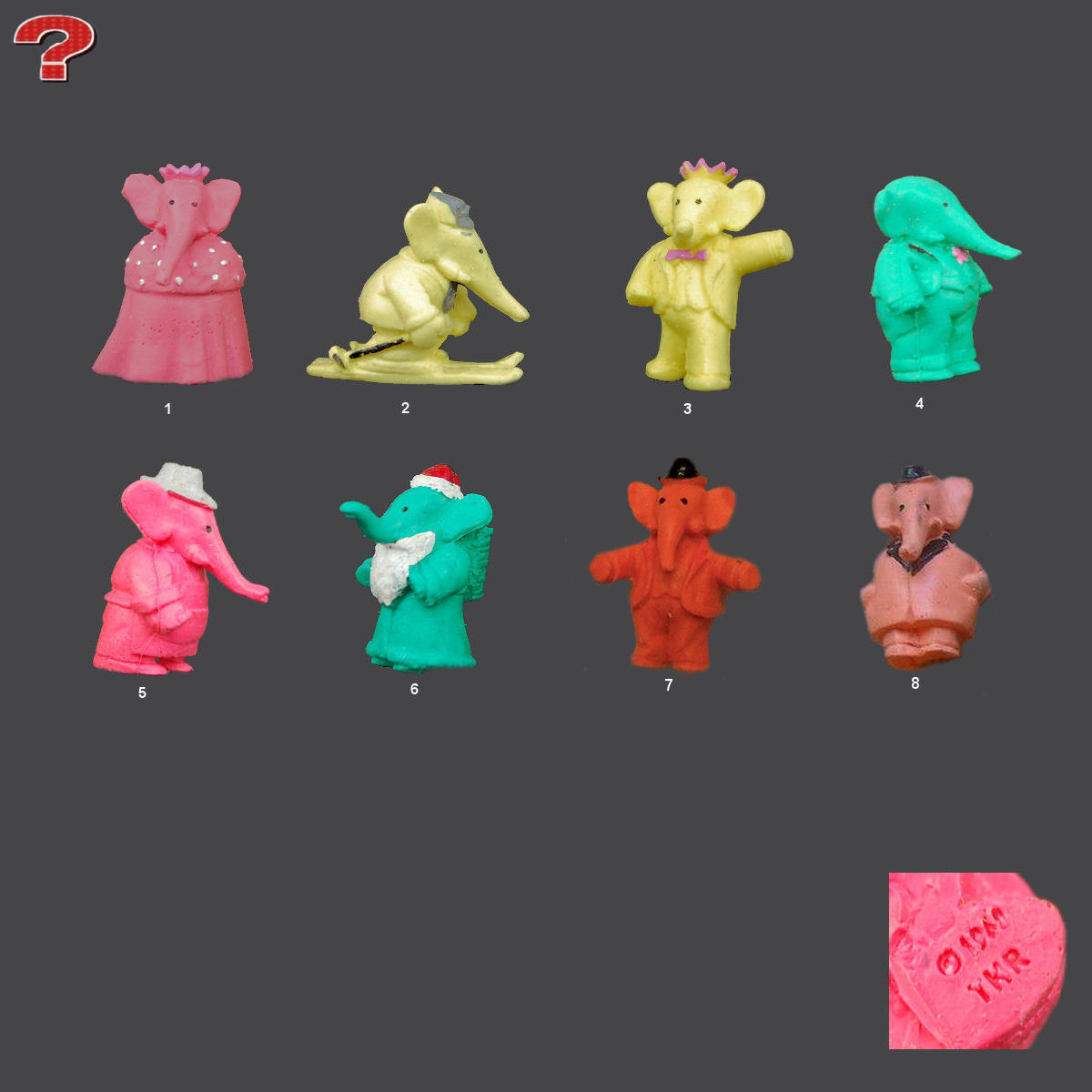 This series on Babar is of unknown origin. Eight are listed and the characters can be of different color. They are " plastic exfoliates " Glup's way of Esso. It dates 1969, dates the first appearance on the TV of Babar.