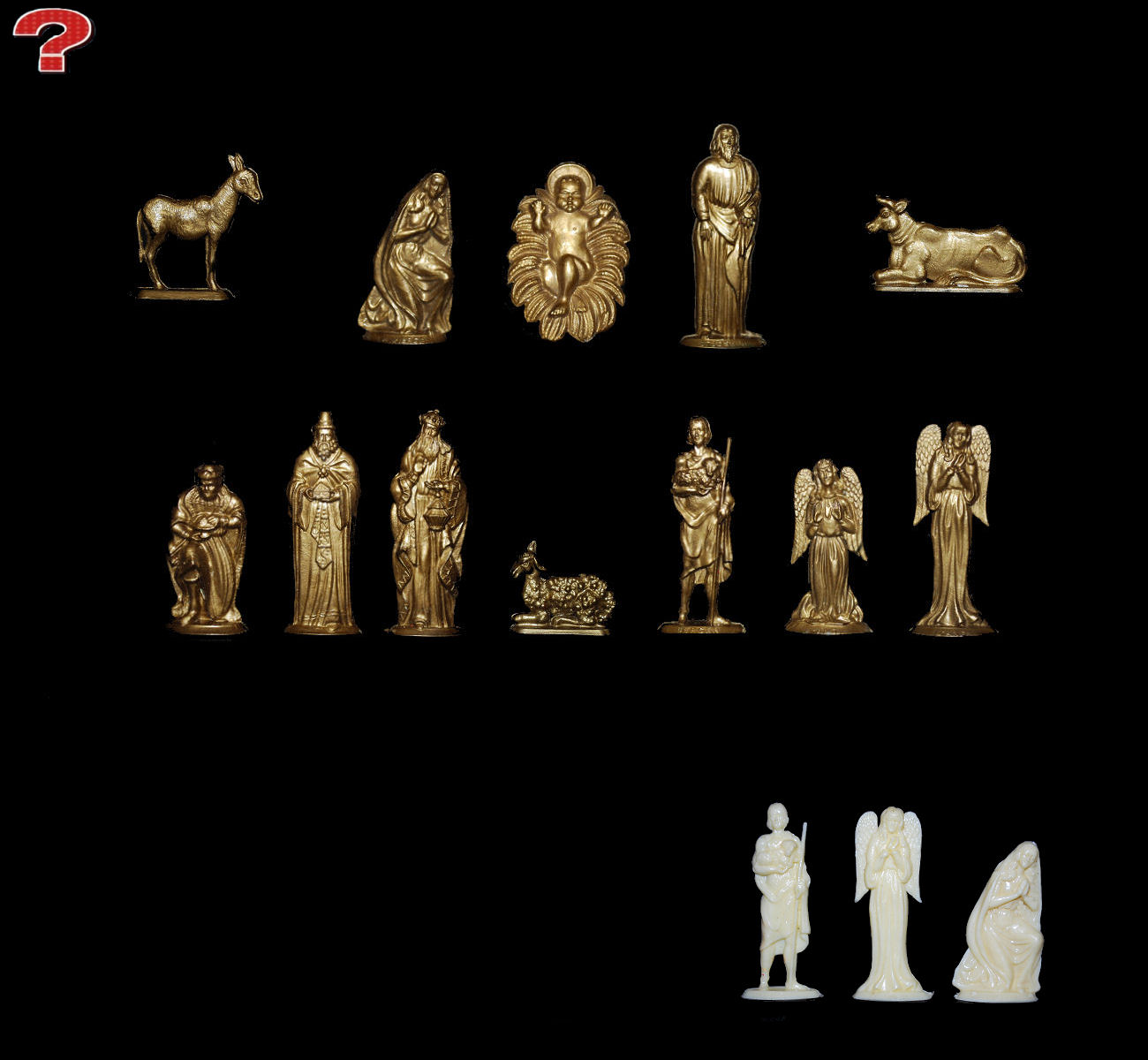 All figures have their name engraved in French on the front of the base, with the exception of Jesus, Three Kings and animals.