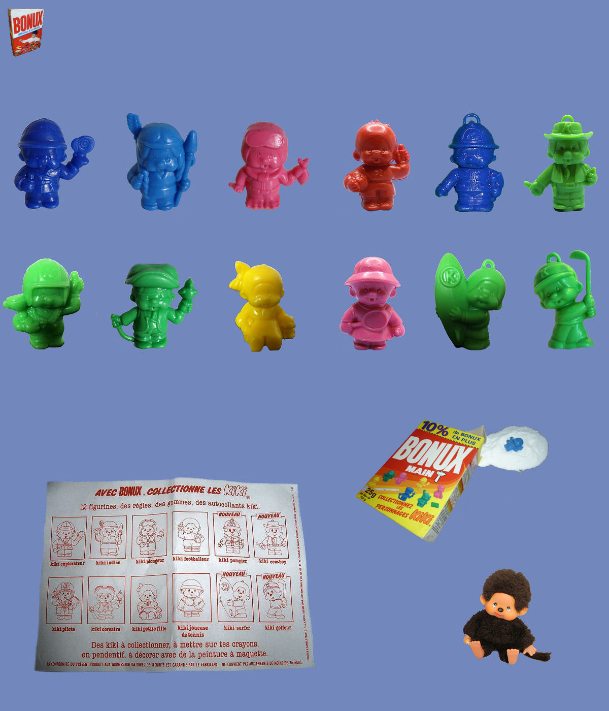 Série de 12 personnages des années 80, sur le thème du fameux Kiki. Ce Kiki de tous les Kiki est d'origine japonaise, son vrai nom est "Monchhichi" signifiant "Mon petit". Sa création date de 1974. Au départ c'est un petit singe, aux yeux bleus puis marrons et au visage presque humain. Il va évoluer vers l'apparence d'un bébé.